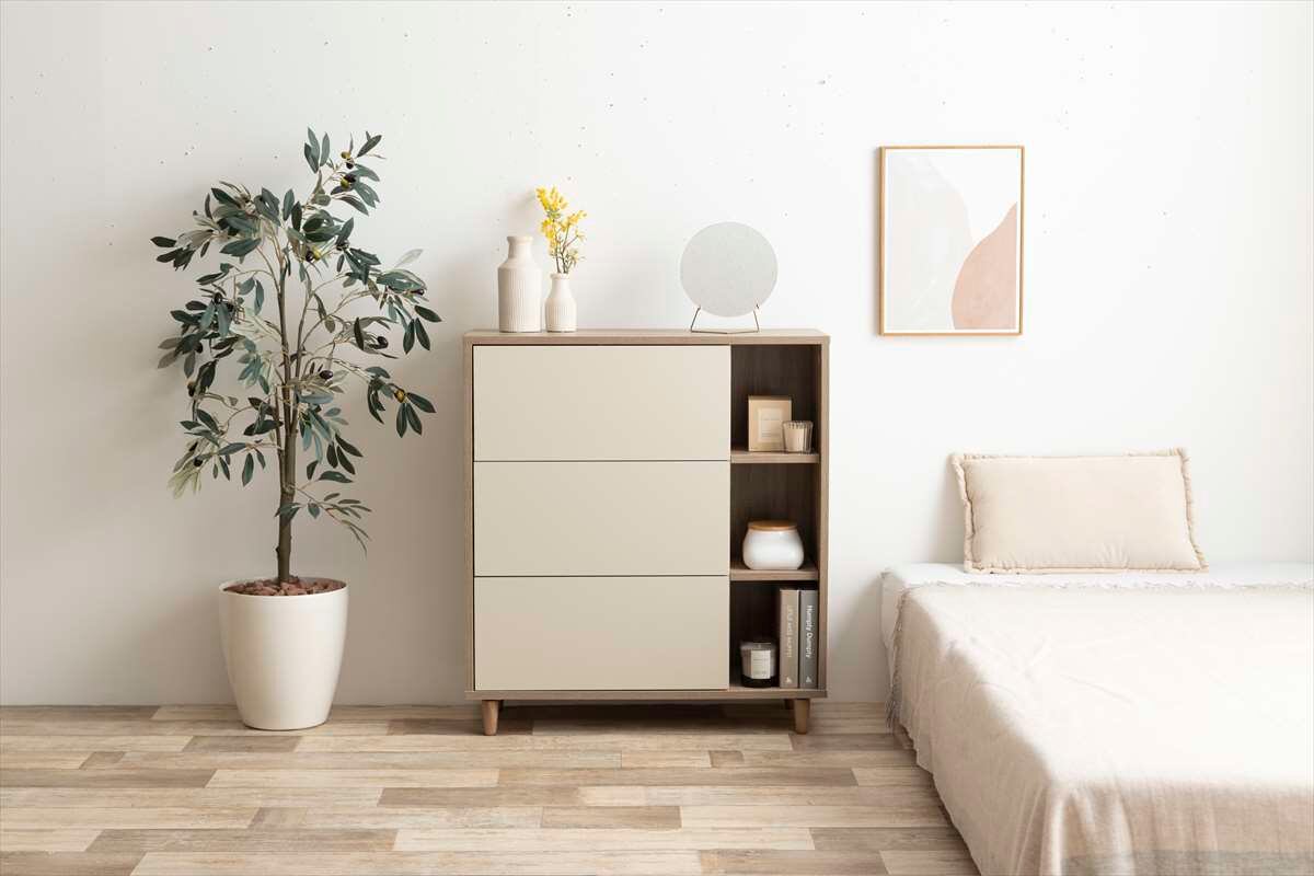 美しい木目調×アイボリーのバイカラーが特徴の『Erin(エリン)』シリーズのバイカラー棚付きチェスト