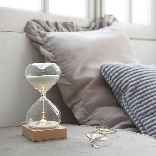 美しいフォルムが魅力のLED付砂時計15分計。白い砂がさらさらと静かに落ちていく様子をのんびりと眺めたり、ふと目にした瞬間に癒されたり。天然木から温かなオレンジ色のライトを照らせばたちまち幻想的なムードに。
