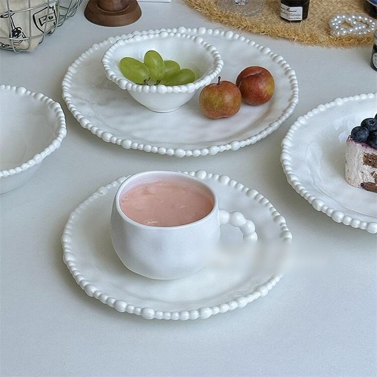 フレンチテイストの上品さとモダンなデザインが融合した「真珠縁取り食器セット」です。手作りの温もりを感じる不規則なフォルムが特徴で、純白の陶器に施された真珠のような立体縁取りが、テーブルに洗練されたアクセントを添えます。