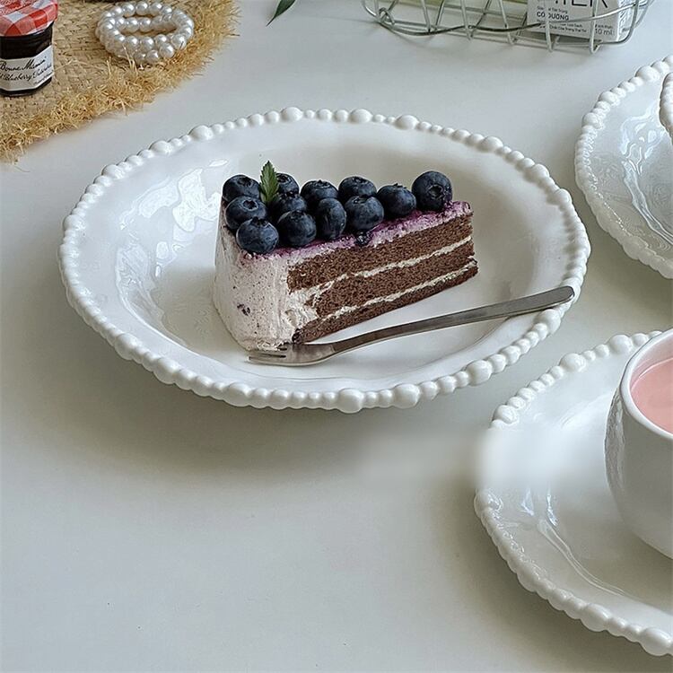 フレンチテイストの上品さとモダンなデザインが融合した「真珠縁取り食器セット」です。手作りの温もりを感じる不規則なフォルムが特徴で、純白の陶器に施された真珠のような立体縁取りが、テーブルに洗練されたアクセントを添えます。