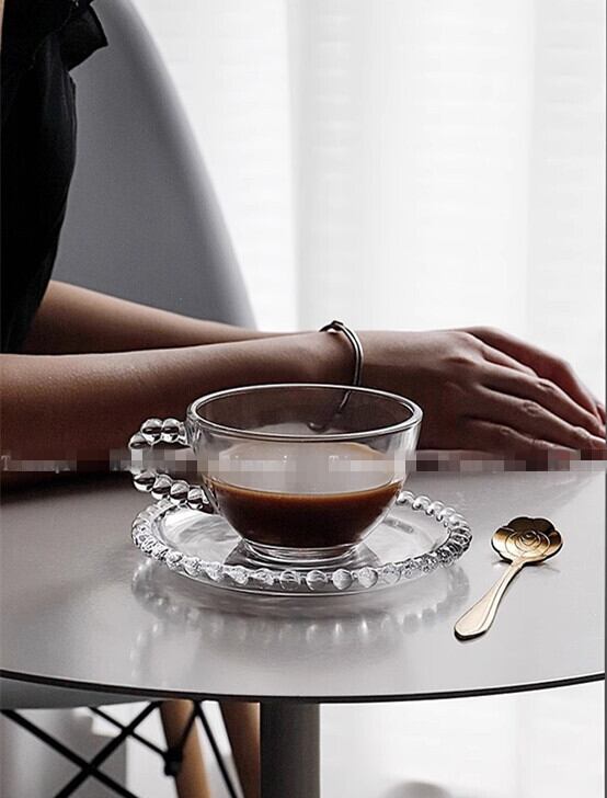 クリアガラスに縁と持ち手のつぶつぶがかわいらしいカップソーサーです。