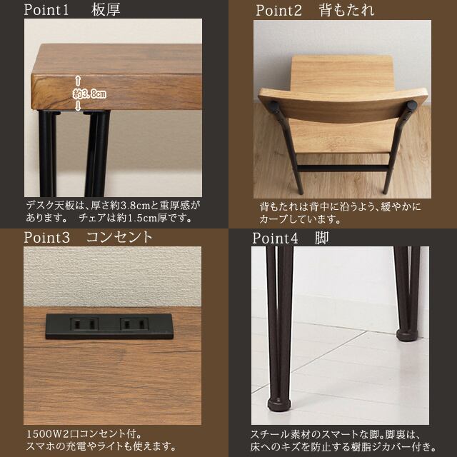 ◆デスク天板は、厚さ約3.8cmと重厚感があります。チェアは、約1.5cm厚です。
