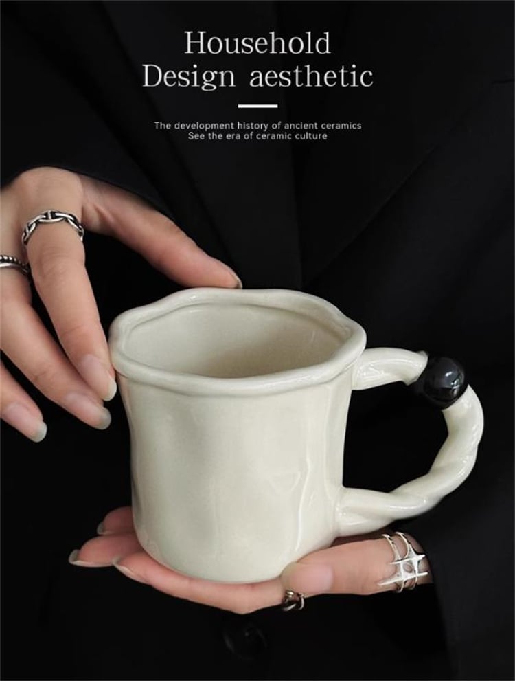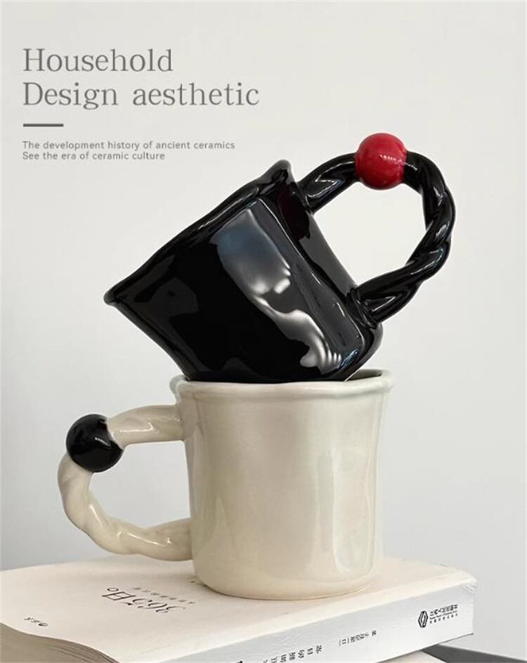 縄状にねじったハンドルと赤、黒のアクセントがおしゃれなマグカップです。