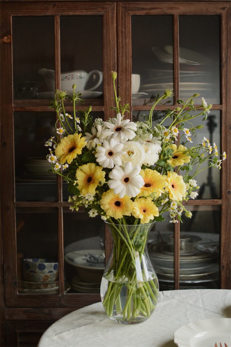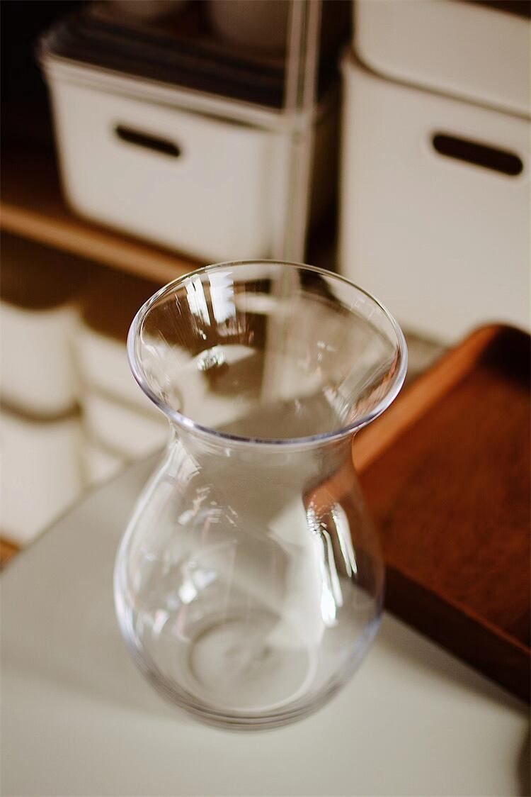 くびれのあるシンプルなガラス花瓶です。シンプルゆえ、どんな種類のお花でも映えます。