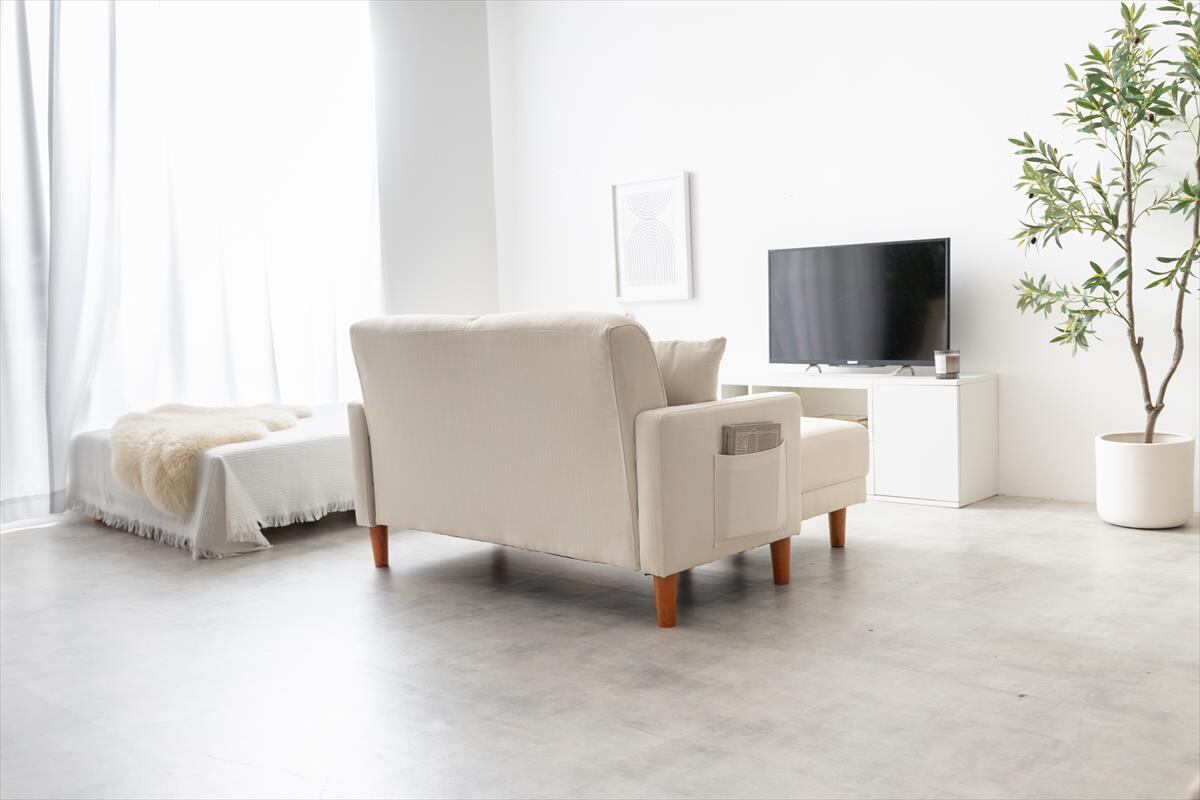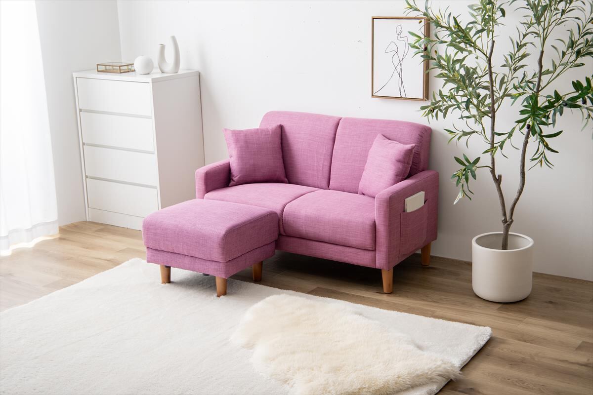 ファブリックと天然木が温かみのある印象を与える『Emma(エマ)』2人掛けコンパクトソファ+オットマン