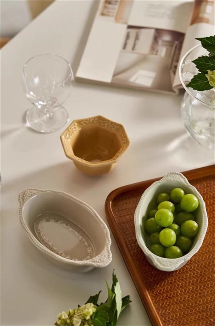 レースもようがかわいらしい器。淡い色で優しい印象。