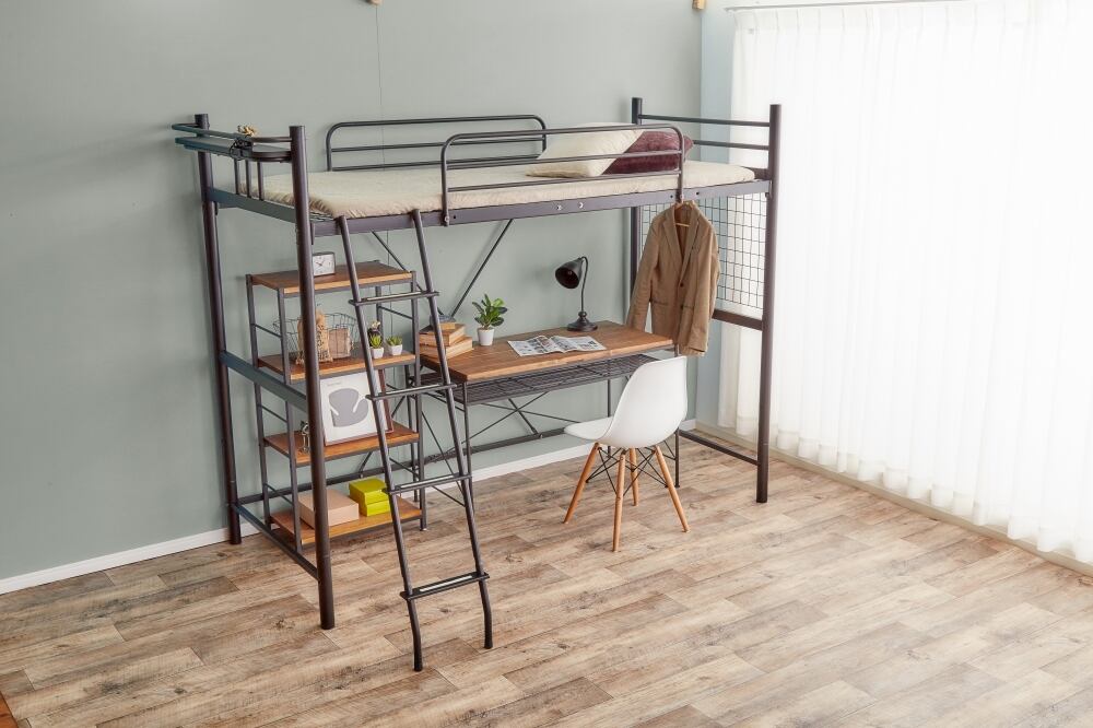 高さ調節可能パイプベッド。お部屋をもっと広々使えるロフトベッド。