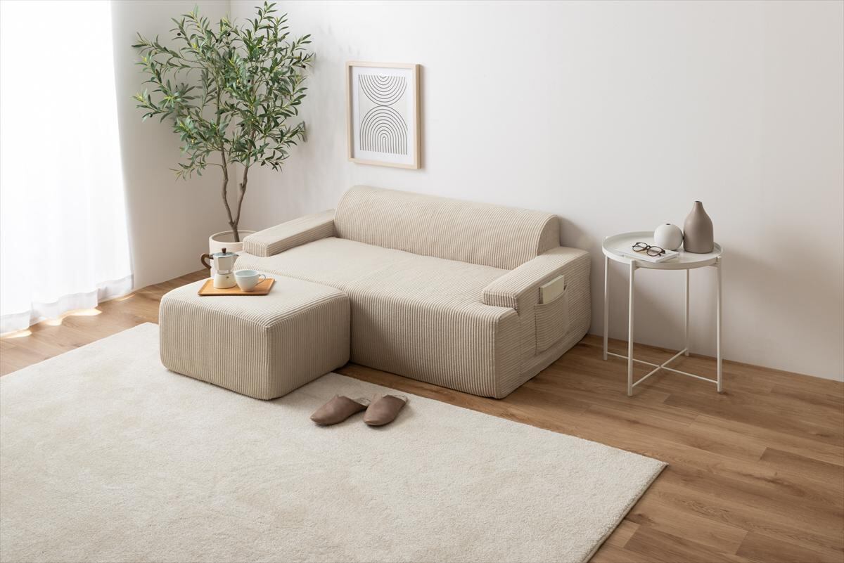 小さく届いて広々使える、快適圧縮シリーズの2人掛けソファ+オットマンセット