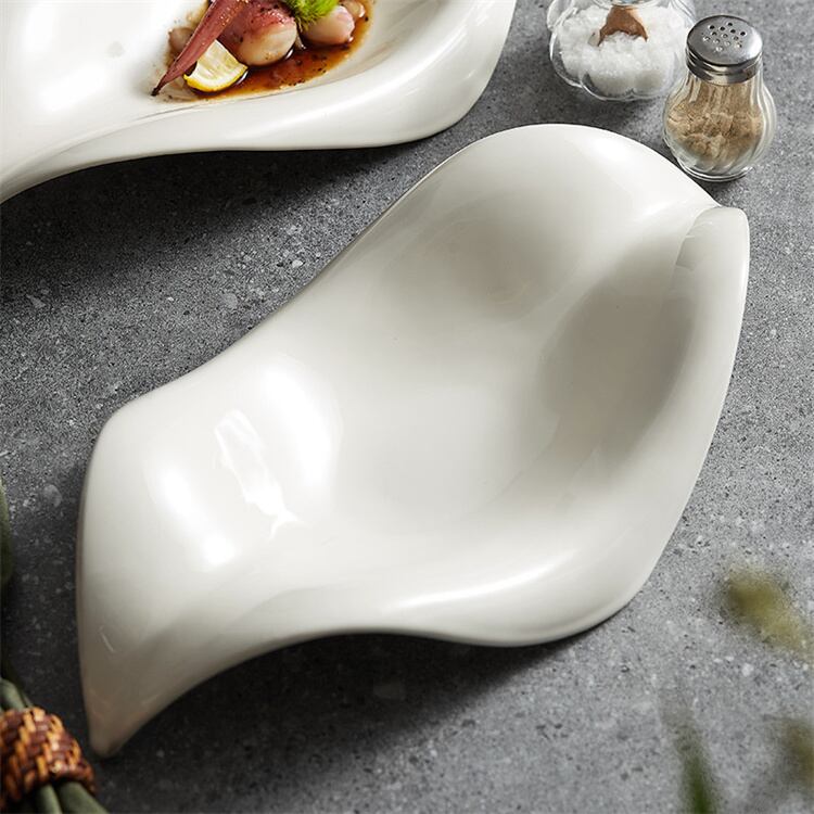高白泥は不規則な葉の形を結合し、ファッション的な西洋現代の作品もあれば、古風で温和な東方の手作の良いものもある。単一の色は釉薬色によって質感を増すことで料理本来の色の輝きを際立たせるとともに、シェフのアイデアの発揮にも便利である。